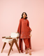 A deep red three-piece dress featuring a shirt adorned with intricate embroidery on the neckline, sleeves, and hem. Paired with matching pants and a flowing dupatta, this set brings together traditional charm and modern elegance.