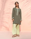 A black co-ord set elevated with camel-toned detailing along the neckline and sleeves. Clean tailoring and bold contrast make it a powerful yet polished statement.